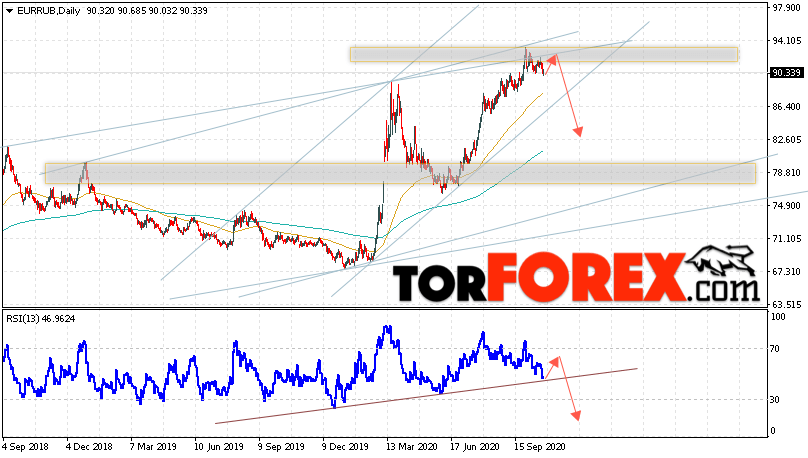 Дополнительным сигналом в пользу падения валютной пары EUR/RUB на текущей торговой неделе выступит тест верхней границы нисходящей модели ”Волна Вульфа”. Вторым сигналом станет отскок от линии сопротивления на индикаторе относительной силы. Отменой варианта падения пары EUR/RUB на текущей торговой неделю 26 — 30 октября 2020 станет сильный рост и пробой уровня 96.75 Евро за Рубль. Это укажет на пробой области сопротивления и ускорение подъёма пары Евро Рубль в область выше уровня 99.95. Подтверждением падения пары на текущей торговой неделе выступит пробой области поддержки и закрытие ниже уровня 88.55.