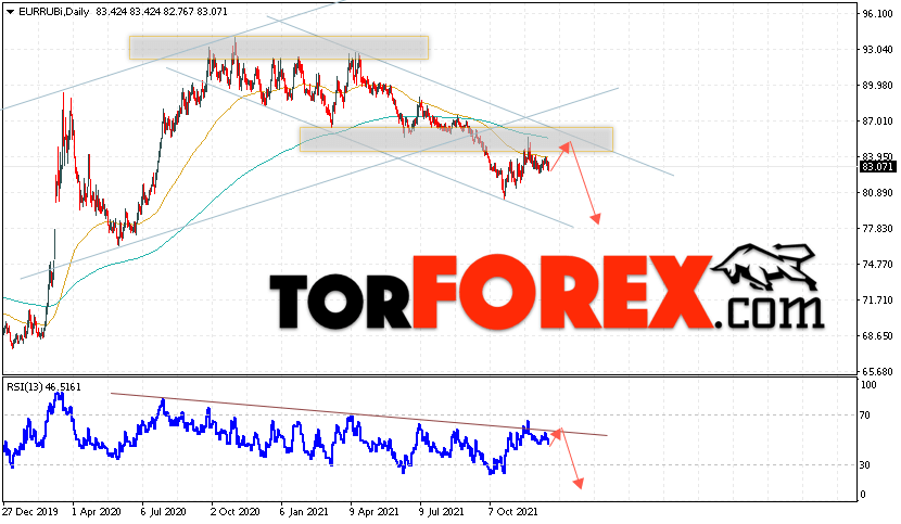 Дополнительным сигналом в пользу снижения валютной пары EUR/RUB на текущей торговой неделе выступит отскок от верхней границы нисходящего канала. Вторым сигналом станет отскок от линии тренда на индикаторе относительной силы. Отменой варианта роста пары EUR/RUB на текущей торговой неделе 27 — 31 декабря 2021 станет падение и пробой уровня 88.45 Евро за Рубль. Это укажет на пробой области сопротивления и подтверждение подъёма пары Евро Рубль в область выше уровня 92.95. Подтверждением падению пары на текущей торговой неделе выступит пробой области поддержки и закрытие котировок ниже уровня 80.55.