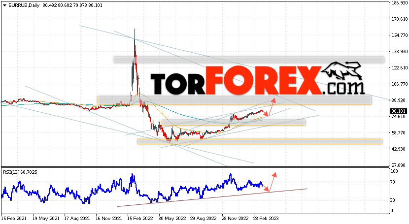 Валютная пара Евро Рубль EUR/RUB завершает торговую неделю вблизи области 80.10 и продолжает движение в рамках роста и бычьего канала. Скользящие средние указывают на наличие медвежьей тенденции по паре. Цены пробили область между сигнальными линиями вверх, что указывает на давление со стороны покупателей европейской валюты и потенциальное продолжение роста уже с текущих уровней. В рамках прогноза курса Евро к Рублю на текущую неделю неделю 27 — 31 марта 2023 стоит ожидать попытку развития снижения цены и тест уровня поддержки вблизи области 74.85 Рублей за Евро. Затем, отскок вверх и продолжение роста валютной пары в область выше уровня 91.65.