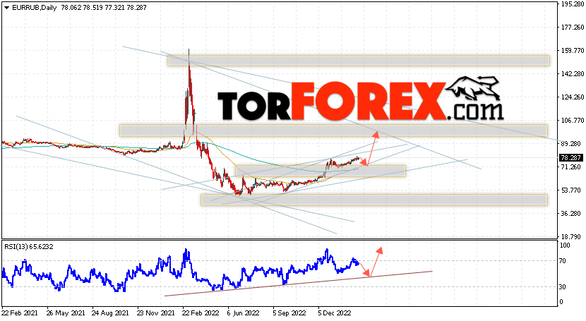 Дополнительным сигналом в пользу роста валютной пары EUR/RUB на текущей торговой неделе выступит отскок от нижней границы бычьего канала. Вторым сигналом станет отскок от восходящей линии тренда на индикаторе относительной силы. Отменой варианта роста пары EUR/RUB на текущей торговой неделе 27 февраля — 3 марта 2023 станет падение и пробой уровня 68.05 Евро за Рубль. Это укажет на пробой области поддержки и продолжение падения пары Евро Рубль в область ниже уровня 55.35. Подтверждением росту пары на текущей торговой неделе выступит пробой области сопротивления и закрытие котировок выше уровня 90.75, что укажет на пробой верхней границы бычьего канала, а это сигнал к росту на ширину канала.