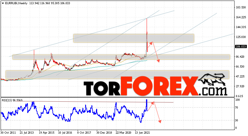 Дополнительным сигналом в пользу падения валютной пары EUR/RUB на текущей торговой неделе выступит отскок от верхней границы бычьего канала. Вторым сигналом станет отскок от линии сопротивления на индикаторе относительной силы. Отменой варианта падения пары EUR/RUB на текущей торговой неделе 28 марта — 1 апреля 2022 станет сильный рост и пробой уровня 135.05 Евро за Рубль. Это укажет на пробой области сопротивления и продолжение роста пары Евро Рубль в область выше уровня 150.05. Подтверждением падению пары на текущей торговой неделе выступит пробой области поддержки и закрытие котировок ниже уровня 95.05.