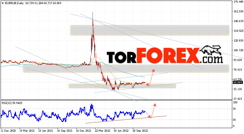 Валютная пара Евро Рубль EUR/RUB завершает торговую неделю вблизи области 60.86 и продолжает движение в рамках роста и бычьего канала. Скользящие средние указывают на наличие медвежьей тенденции по паре. Цены вновь тестируют область между сигнальными линиями, что указывает на давление со стороны продавцов европейской валюты и потенциальное продолжение падения уже с текущих уровней. В рамках прогноза курса Евро к Рублю на текущую неделю неделю 28 ноября — 2 декабря 2022 стоит ожидать попытку развития снижения цены и тест уровня поддержки вблизи области 58.05 Рублей за Евро. Затем, отскок вверх и продолжение роста валютной пары в область выше уровня 75.45.