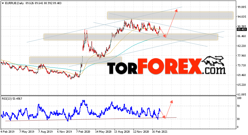 Валютная пара Евро Рубль EUR/RUB завершает торговую неделю вблизи области 89.40 и продолжает движение в рамках падения и нисходящего канала. Скользящие средние указывают на наличие бычьей тенденции по паре. Цены вновь тестируют область между сигнальными линиями, что указывает на давление со стороны покупателей европейской валюты и потенциальное продолжение роста уже с текущих уровней. В рамках прогноза курса Евро к Рублю на текущую неделю неделю 29 марта — 2 апреля 2021 стоит ожидать попытку продолжения развития падения цены и тест уровня поддержки вблизи области 86.25 Рублей за Евро. Затем, отскок и продолжение роста валютной пары в область выше уровня 95.25.
