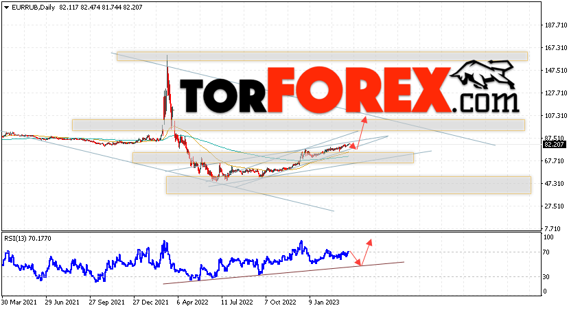Дополнительным сигналом в пользу роста валютной пары EUR/RUB на текущей торговой неделе выступит отскок от нижней границы бычьего канала. Вторым сигналом станет отскок от восходящей линии тренда на индикаторе относительной силы. Отменой варианта роста пары EUR/RUB на текущей торговой неделе 3 — 7 апреля 2023 станет падение и пробой уровня 68.05 Евро за Рубль. Это укажет на пробой области поддержки и продолжение падения пары Евро Рубль в область ниже уровня 65.35. Подтверждением росту пары на текущей торговой неделе выступит пробой области сопротивления и закрытие котировок выше уровня 88.75, что укажет на пробой верхней границы бычьего канала, а это сигнал к росту на ширину канала.