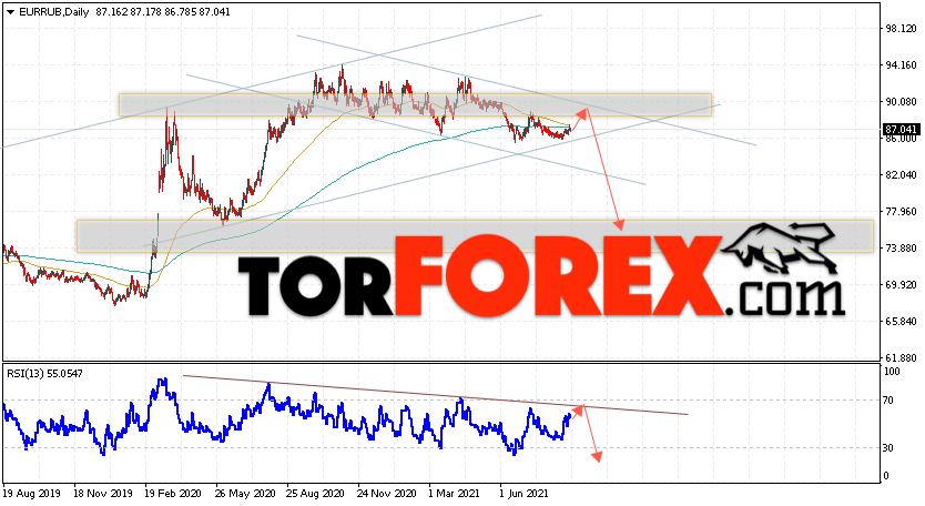 Дополнительным сигналом в пользу падения валютной пары EUR/RUB на текущей торговой неделе выступит отскок от области сопротивления на графике цены. Вторым сигналом станет отскок от линии тренда на индикаторе относительной силы. Отменой варианта падения пары EUR/RUB на текущей торговой неделе 30 августа — 3 сентября 2021 станет сильный рост и пробой уровня 92.55 Евро за Рубль. Это укажет на пробой области сопротивления и ускорение подъёма пары Евро Рубль в область выше уровня 96.75. Подтверждением падения пары на текущей торговой неделе выступит пробой области поддержки и закрытие ниже уровня 82.75, что укажет на пробой нижней границы нисходящего канала.