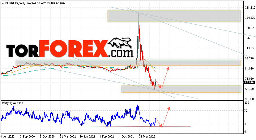 Дополнительным сигналом в пользу роста валютной пары EUR/RUB на текущей торговой неделе выступит отскок от нижней границы нисходящего канала. Вторым сигналом станет отскок от линии поддержки на индикаторе относительной силы. Отменой варианта роста пары EUR/RUB на текущей торговой неделе 30 мая — 3 июня 2022 станет падение и пробой уровня 53.05 Евро за Рубль. Это укажет на пробой области поддержки и продолжение падения пары Евро Рубль в область ниже уровня 46.05. Подтверждением росту пары на текущей торговой неделе выступит пробой области сопротивления и закрытие котировок выше уровня 73.05.
