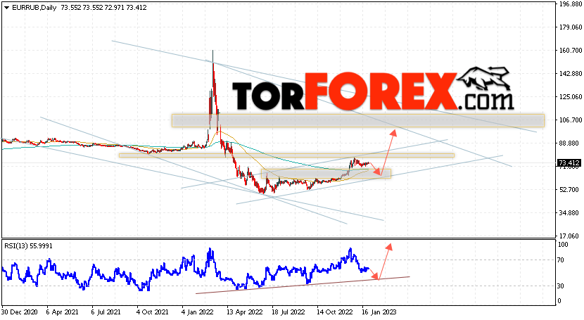Дополнительным сигналом в пользу роста валютной пары EUR/RUB на текущей торговой неделе выступит отскок от нижней границы бычьего канала. Вторым сигналом станет отскок от восходящей линии тренда на индикаторе относительной силы. Отменой варианта роста пары EUR/RUB на текущей торговой неделе 30 января — 3 февраля 2023 станет падение и пробой уровня 57.05 Евро за Рубль. Это укажет на пробой области поддержки и продолжение падения пары Евро Рубль в область ниже уровня 51.65. Подтверждением росту пары на текущей торговой неделе выступит пробой области сопротивления и закрытие котировок выше уровня 84.05, что укажет на пробой верхней границы бычьего канала.