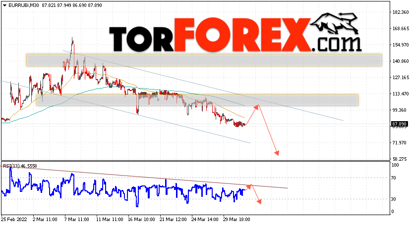 Дополнительным сигналом в пользу падения валютной пары EUR/RUB на текущей торговой неделе выступит отскок от верхней границы бычьего канала. Вторым сигналом станет отскок от линии сопротивления на индикаторе относительной силы. Отменой варианта падения пары EUR/RUB на текущей торговой неделе 4 — 8 апреля 2022 станет сильный рост и пробой уровня 115.05 Евро за Рубль. Это укажет на пробой области сопротивления и продолжение роста пары Евро Рубль в область выше уровня 125.05. Подтверждением падению пары на текущей торговой неделе выступит пробой области поддержки и закрытие котировок ниже уровня 85.05.