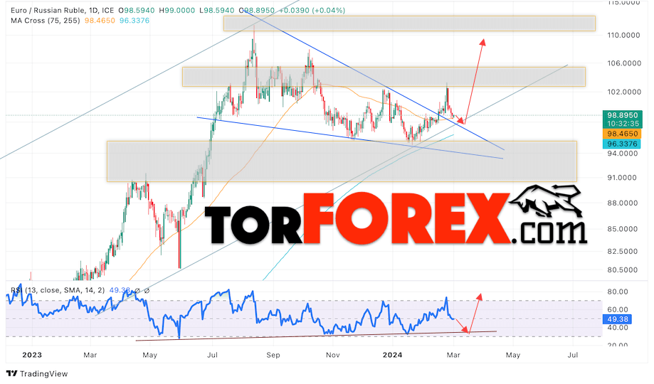Дополнительным сигналом в пользу роста валютной пары EUR/RUB на текущей торговой неделе выступит отскок от верхней границы модели «Клин». Вторым сигналом станет отскок от линии поддержки на индикаторе относительной силы (RSI). Отменой варианта роста пары EUR/RUB на текущей торговой неделе 4 — 8 марта 2024 станет падение и пробой уровня 94.05 Евро за Рубль. Это укажет на пробой области поддержки и продолжение падения пары Евро Рубль в область выше уровня 87.05. Подтверждением росту пары на текущей торговой неделе выступит пробой области сопротивления и закрытие котировок выше уровня 104.75.