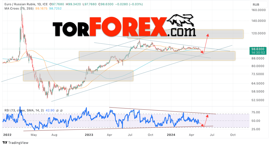 Дополнительным сигналом в пользу роста валютной пары EUR/RUB на текущей торговой неделе выступит отскок от нижней границы бычьего канала. Вторым сигналом станет отскок от линии поддержки на индикаторе относительной силы (RSI). Отменой варианта роста пары EUR/RUB на текущей торговой неделе 6 — 10 мая 2024 станет падение и пробой уровня 86.45 Евро за Рубль. Это укажет на пробой области поддержки и продолжение падения пары Евро Рубль в область выше уровня 77.45. Подтверждением росту пары на текущей торговой неделе выступит пробой области сопротивления и закрытие котировок выше уровня 101.65, что укажет на пробой верхней границы нисходящего канала коррекции.