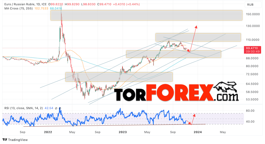 Дополнительным сигналом в пользу роста валютной пары EUR/RUB на текущей торговой неделе выступит отскок от нижней границы бычьего канала. Вторым сигналом станет отскок от линии поддержки на индикаторе относительной силы (RSI). Отменой варианта роста пары EUR/RUB на текущей торговой неделе 6 — 10 ноября 2023 станет падение и пробой уровня 88.45 Евро за Рубль. Это укажет на пробой области поддержки и продолжение падения пары Евро Рубль в область ниже уровня 85.05. Подтверждением росту пары на текущей торговой неделе выступит пробой области сопротивления и закрытие котировок выше уровня 103.65, что укажет на пробой верхней границы медвежьего канала коррекции.