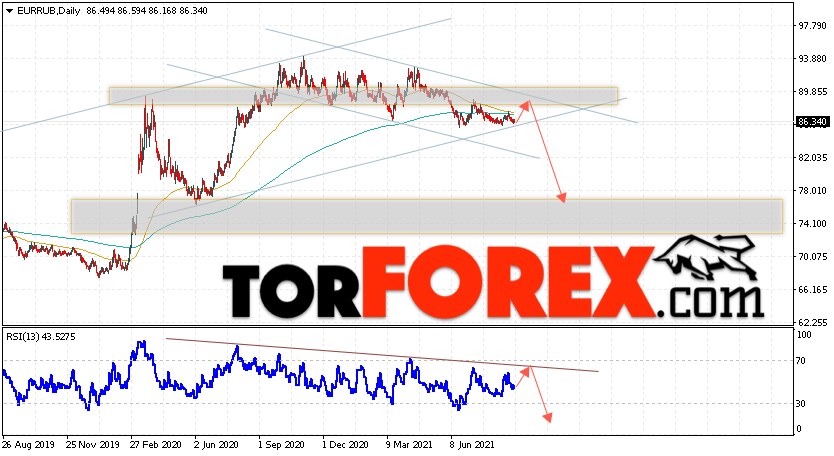 Валютная пара Евро Рубль EUR/RUB завершает торговую неделю вблизи области 86.34 и продолжает движение в рамках снижения и медвежьего канала. Скользящие средние указывают на наличие бычьей тенденции по паре. Цены пробили область между сигнальными линиями вниз, что указывает на давление со стороны продавцов европейской валюты и потенциальное продолжение падения уже с текущих уровней. В рамках прогноза курса Евро к Рублю на текущую неделю неделю 6 — 10 сентября 2021 стоит ожидать попытку развития коррекции цены и тест уровня сопротивления вблизи области 87.45 Рублей за Евро. Затем, отскок и продолжение падения валютной пары в область ниже уровня 77.85.