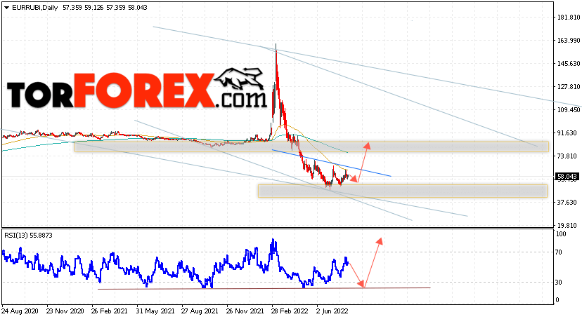 Дополнительным сигналом в пользу роста валютной пары EUR/RUB на текущей торговой неделе выступит отскок от нижней границы разворотной модели ”Голова и плечи”. Вторым сигналом станет отскок от линии поддержки на индикаторе относительной силы. Отменой варианта роста пары EUR/RUB на текущей торговой неделе 8 — 12 августа 2022 станет падение и пробой уровня 44.55 Евро за Рубль. Это укажет на пробой области поддержки и продолжение падения пары Евро Рубль в область ниже уровня 35.05. Подтверждением росту пары на текущей торговой неделе выступит пробой области сопротивления и закрытие котировок выше уровня 64.55, что укажет на пробой верхней границы разворотной модели ”Голова и плечи” и начало отработки паттерна с целями вверху.