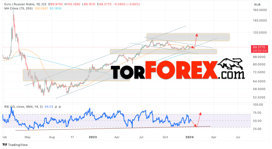 Дополнительным сигналом в пользу роста валютной пары EUR/RUB на текущей торговой неделе выступит отскок от нижней границы бычьего канала. Вторым сигналом станет отскок от линии поддержки на индикаторе относительной силы (RSI). Отменой варианта роста пары EUR/RUB на текущей торговой неделе 8 — 12 января 2024 станет падение и пробой уровня 88.05 Евро за Рубль. Это укажет на пробой области поддержки и продолжение падения пары Евро Рубль в область ниже уровня 82.55. Подтверждением росту пары на текущей торговой неделе выступит пробой области сопротивления и закрытие котировок выше уровня 103.65, что укажет на пробой верхней границы медвежьего канала коррекции.