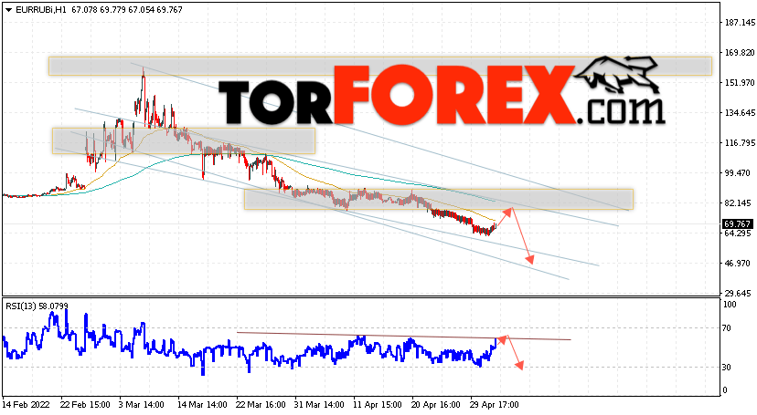 Дополнительным сигналом в пользу падения валютной пары EUR/RUB на текущей торговой неделе выступит отскок от верхней границы бычьего канала. Вторым сигналом станет отскок от линии сопротивления на индикаторе относительной силы. Отменой варианта падения пары EUR/RUB на текущей торговой неделе 9 — 13 мая 2022 станет сильный рост и пробой уровня 93.05 Евро за Рубль. Это укажет на пробой области сопротивления и продолжение роста пары Евро Рубль в область выше уровня 105.05. Подтверждением падению пары на текущей торговой неделе выступит пробой области поддержки и закрытие котировок ниже уровня 62.05.