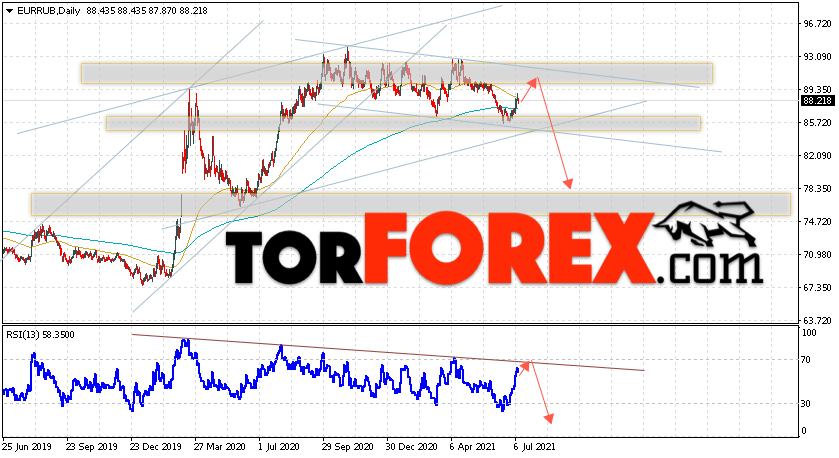 Дополнительным сигналом в пользу падения валютной пары EUR/RUB на текущей торговой неделе выступит отскок от области сопротивления на графике цены. Вторым сигналом станет отскок от линии тренда на индикаторе относительной силы. Отменой варианта падения пары EUR/RUB на текущей торговой неделе 12 — 16 июля 2021 станет сильный рост и пробой уровня 93.55 Евро за Рубль. Это укажет на пробой области сопротивления и ускорение подъёма пары Евро Рубль в область выше уровня 96.45. Подтверждением падения пары на текущей торговой неделе выступит пробой области поддержки и закрытие ниже уровня 84.55, что укажет на пробой нижней границы нисходящего канала.