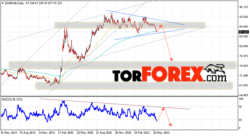 Дополнительным сигналом в пользу падения валютной пары EUR/RUB на текущей торговой неделе выступит отскок от области сопротивления. Вторым сигналом станет отскок от линии тренда на индикаторе относительной силы. Отменой варианта падения пары EUR/RUB на текущей торговой неделе 14 — 18 июня 2021 станет сильный рост и пробой уровня 93.15 Евро за Рубль. Это укажет на пробой области сопротивления и ускорение подъёма пары Евро Рубль в область выше уровня 96.55. Подтверждением падения пары на текущей торговой неделе выступит пробой области поддержки и закрытие ниже уровня 86.25.