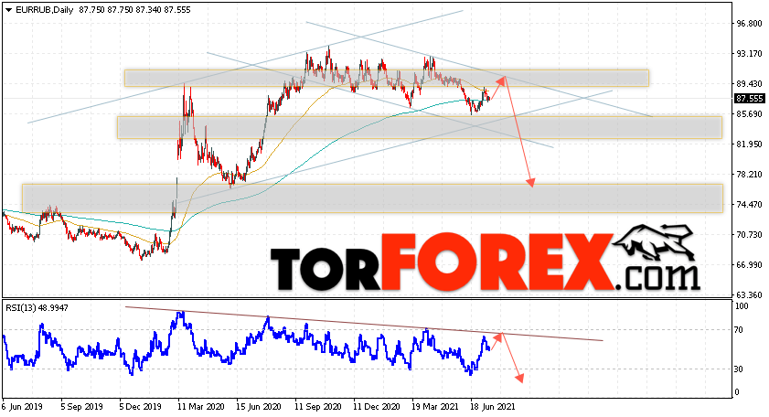 Дополнительным сигналом в пользу падения валютной пары EUR/RUB на текущей торговой неделе выступит отскок от области сопротивления на графике цены. Вторым сигналом станет отскок от линии тренда на индикаторе относительной силы. Отменой варианта падения пары EUR/RUB на текущей торговой неделе 19 — 23 июля 2021 станет сильный рост и пробой уровня 93.45 Евро за Рубль. Это укажет на пробой области сопротивления и ускорение подъёма пары Евро Рубль в область выше уровня 96.65. Подтверждением падения пары на текущей торговой неделе выступит пробой области поддержки и закрытие ниже уровня 83.65, что укажет на пробой нижней границы нисходящего канала.