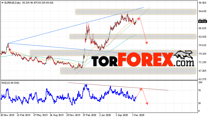 Дополнительным сигналом в пользу падения валютной пары EUR/RUB на текущей торговой неделе выступит тест нижнем границы модели ”Волна Вульфа”. Вторым сигналом станет отскок от линии сопротивления на индикаторе относительной силы. Отменой варианта падения пары EUR/RUB на текущей торговой неделе 21 — 25 декабря 2020 станет сильный рост и пробой уровня 95.35 Евро за Рубль. Это укажет на пробой области сопротивления и ускорение подъёма пары Евро Рубль в область выше уровня 99.45. Подтверждением падения пары на текущей торговой неделе выступит пробой области поддержки и закрытие ниже уровня 86.25.