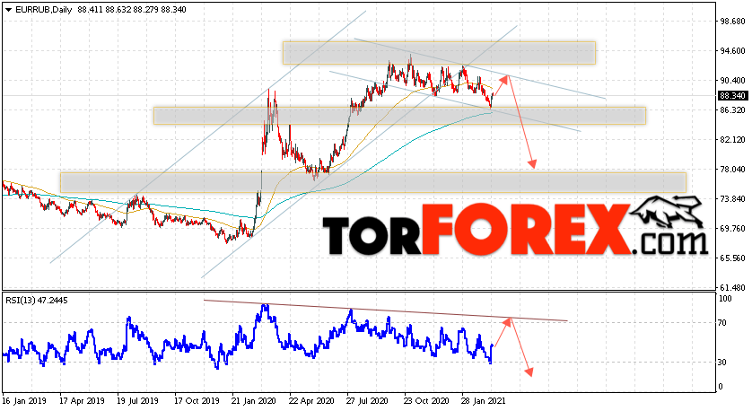Дополнительным сигналом в пользу падения валютной пары EUR/RUB на текущей торговой неделе выступит отскок от верхней границы нисходящего канала. Вторым сигналом станет отскок от линии сопротивления на индикаторе относительной силы. Отменой варианта падения пары EUR/RUB на текущей торговой неделе 22 — 26 марта 2021 станет сильный рост и пробой уровня 92.85 Евро за Рубль. Это укажет на пробой области сопротивления и ускорение подъёма пары Евро Рубль в область выше уровня 101.75. Подтверждением падения пары на текущей торговой неделе выступит пробой области поддержки и закрытие ниже уровня 84.05.