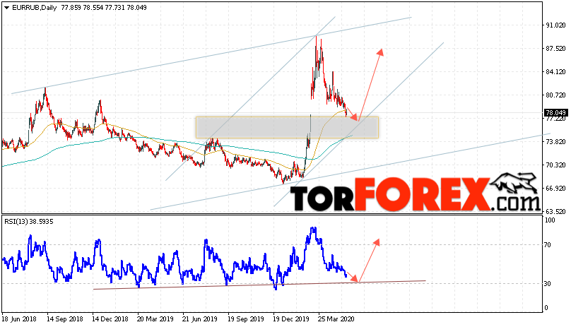 Дополнительным сигналом в пользу роста валютной пары EUR/RUB на текущей торговой неделе выступит тест нижней границы восходящего канала. Вторым сигналом станет отскок от линии поддержки на индикаторе относительной силы. Отменой варианта роста пары EUR/RUB на текущей торговой неделе 25 — 29 мая 2020 станет падение и пробой уровня 73.85 Евро за Рубль. Это укажет на пробой нижней границы канала и ускорение падения пары Евро Рубль в область ниже уровня 70.05. Подтверждением подъёма пары на текущей торговой неделе выступит пробой уровня сопротивления и закрытие выше уровня 83.05.