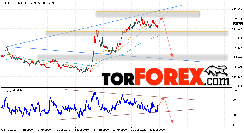 Дополнительным сигналом в пользу падения валютной пары EUR/RUB на текущей торговой неделе выступит тест верхней границы модели ”Волна Вульфа”. Вторым сигналом станет отскок от линии сопротивления на индикаторе относительной силы. Отменой варианта падения пары EUR/RUB на текущей торговой неделе 25 — 29 января 2021 станет сильный рост и пробой уровня 97.45 Евро за Рубль. Это укажет на пробой области сопротивления и ускорение подъёма пары Евро Рубль в область выше уровня 101.65. Подтверждением падения пары на текущей торговой неделе выступит пробой области поддержки и закрытие ниже уровня 86.55.