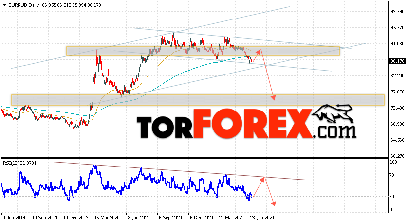 Дополнительным сигналом в пользу падения валютной пары EUR/RUB на текущей торговой неделе выступит отскок от области сопротивления на графике цены. Вторым сигналом станет отскок от линии тренда на индикаторе относительной силы. Отменой варианта падения пары EUR/RUB на текущей торговой неделе 28 июня — 2 июля 2021 станет сильный рост и пробой уровня 92.35 Евро за Рубль. Это укажет на пробой области сопротивления и ускорение подъёма пары Евро Рубль в область выше уровня 95.45. Подтверждением падения пары на текущей торговой неделе выступит пробой области поддержки и закрытие ниже уровня 82.15.