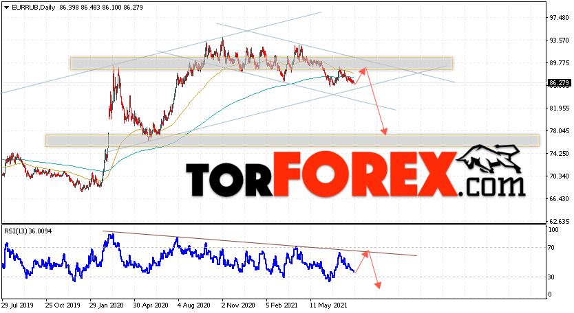 Дополнительным сигналом в пользу падения валютной пары EUR/RUB на текущей торговой неделе выступит отскок от области сопротивления на графике цены. Вторым сигналом станет отскок от линии тренда на индикаторе относительной силы. Отменой варианта падения пары EUR/RUB на текущей торговой неделе 9 — 13 августа 2021 станет сильный рост и пробой уровня 93.15 Евро за Рубль. Это укажет на пробой области сопротивления и ускорение подъёма пары Евро Рубль в область выше уровня 96.55. Подтверждением падения пары на текущей торговой неделе выступит пробой области поддержки и закрытие ниже уровня 81.95, что укажет на пробой нижней границы нисходящего канала.