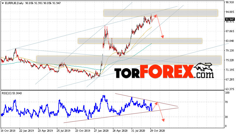 Дополнительным сигналом в пользу падения валютной пары EUR/RUB на текущей торговой неделе выступит тест верхней границы нисходящей модели ”Волна Вульфа”. Вторым сигналом станет отскок от линии сопротивления на индикаторе относительной силы. Отменой варианта падения пары EUR/RUB на текущей торговой неделю 9 — 13 ноября 2020 станет сильный рост и пробой уровня 96.75 Евро за Рубль. Это укажет на пробой области сопротивления и ускорение подъёма пары Евро Рубль в область выше уровня 99.95. Подтверждением падения пары на текущей торговой неделе выступит пробой области поддержки и закрытие ниже уровня 88.45.
