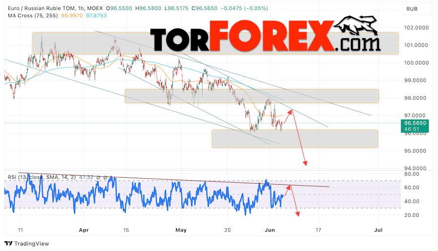Дополнительным сигнальном в пользу снижения валютной пары EUR/RUB на Форекс выступит тест линии линии сопротивления на индикаторе относительной силы (RSI). Вторым сигналом станет отскок от верхней границы нисходящего канала. Отменой варианта снижения валютной пары EUR/RUB на Форекс 6 июня 2024 станет сильный рост и пробой уровня 99.05 Евро за Рубль. Это укажет на пробой области сопротивления и продолжение роста пары Евро Рубль в область выше уровня 103.45. Подтверждением падению валютной пары выступит пробой области поддержки и закрытие котировок инструмента ниже уровня 95.65.