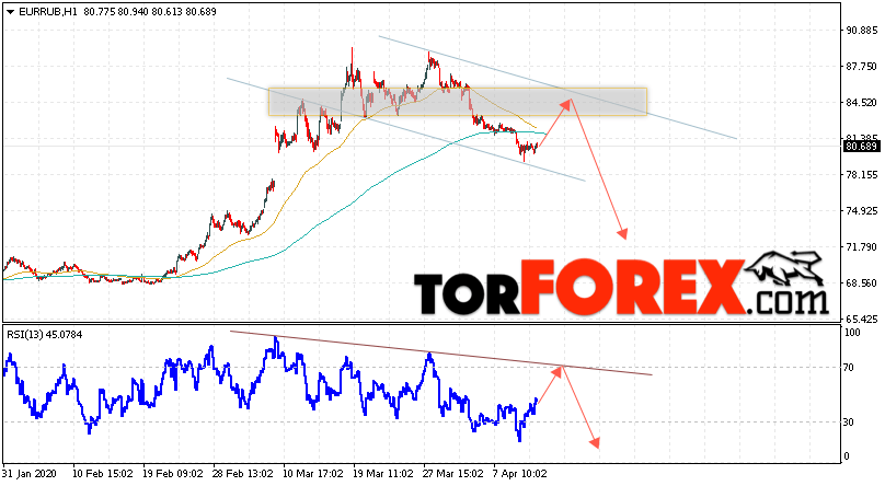 Дополнительным сигнальном в пользу падения валютной пары EUR/RUB на Форекс выступит тест нисходящей линии тренда на индикаторе относительной силы. Вторым сигналом станет отскок от верхней границы нисходящего канала. Отменой варианта падения валютной пары EUR/RUB на Форекс 14 апреля 2020 станет сильный рост и пробой уровня 87.75 Евро за Рубль. Это укажет на пробой области сопротивления и продолжение роста пары Евро Рубль в область выше уровня 90.75. Подтверждением падения валютной пары выступит пробой области поддержки и закрытие котировок инструмента под уровнем 78.05.