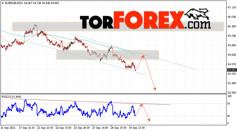Дополнительным сигнальном в пользу снижения валютной пары EUR/RUB на Форекс выступит тест линии тренда на индикаторе относительной силы. Вторым сигналом станет отскок от верхней границы нисходящего канала. Отменой варианта падения валютной пары EUR/RUB на Форекс 1 октября 2021 станет сильный рост и пробой уровня 85.35 Евро за Рубль. Это укажет на пробой области сопротивления и продолжение подъёма пары Евро Рубль в область выше уровня 87.65. Подтверждением падения валютной пары выступит пробой области поддержки и закрытие котировок инструмента под уровнем 83.75.