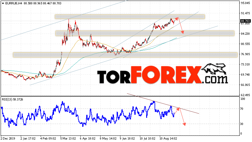 Дополнительным сигнальном в пользу падения валютной пары EUR/RUB на Форекс выступит тест нисходящей линии тренда на индикаторе относительной силы. Вторым сигналом станет пробой нижней границы восходящего канала. Отменой варианта падения валютной пары EUR/RUB на Форекс 1 сентября 2020 станет сильный рост и пробой уровня 92.55 Евро за Рубль. Это укажет на пробой области сопротивления и продолжение роста пары Евро Рубль в область выше уровня 95.05. Подтверждением падения валютной пары выступит пробой области поддержки и закрытие котировок инструмента под уровнем 85.65.