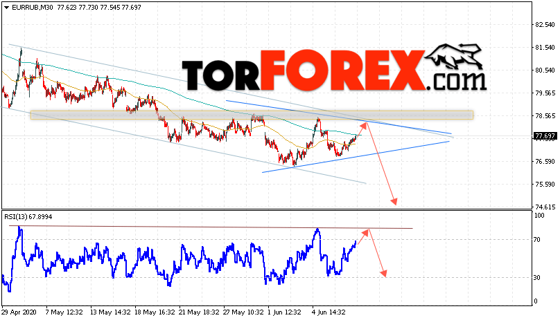 Дополнительным сигнальном в пользу снижения валютной пары EUR/RUB на Форекс выступит тест линии тренда на индикаторе относительной силы. Вторым сигналом станет отскок от верхней границы нисходящего канала. Отменой варианта падения валютной пары EUR/RUB на Форекс 10 июня 2020 станет сильный рост и пробой уровня 79.65 Евро за Рубль. Это укажет на пробой области сопротивления и продолжение подъёма пары Евро Рубль в область выше уровня 81.95. Подтверждением падения валютной пары выступит пробой области поддержки и закрытие котировок инструмента под уровнем 75.95, что укажет на пробой нижнем границы модели «Треугольник».