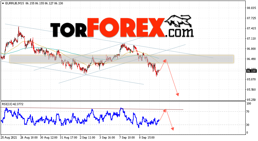Дополнительным сигнальном в пользу снижения валютной пары EUR/RUB на Форекс выступит тест линии тренда на индикаторе относительной силы. Вторым сигналом станет отскок от верхней границы нисходящего канала. Отменой варианта падения валютной пары EUR/RUB на Форекс 10 сентября 2021 станет сильный рост и пробой уровня 87.05 Евро за Рубль. Это укажет на пробой области сопротивления и продолжение подъёма пары Евро Рубль в область выше уровня 91.45. Подтверждением падения валютной пары выступит пробой области поддержки и закрытие котировок инструмента под уровнем 85.35.