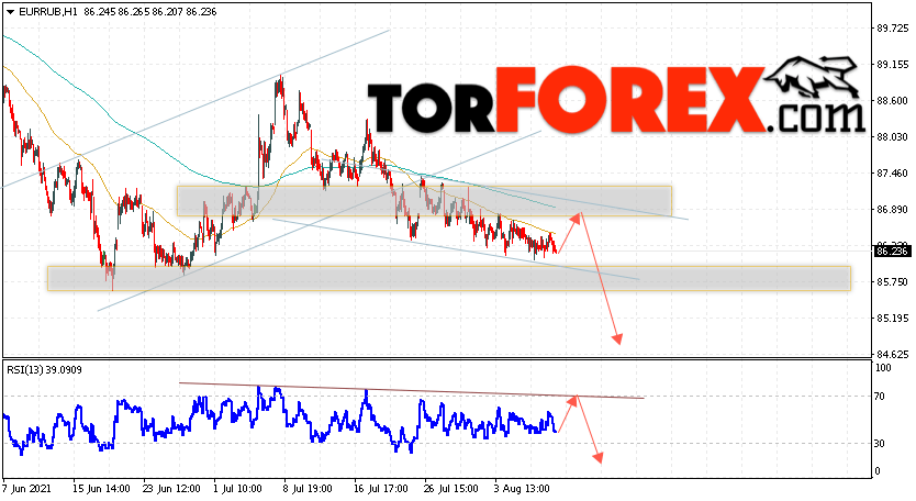 Дополнительным сигнальном в пользу снижения валютной пары EUR/RUB на Форекс выступит тест линии тренда на индикаторе относительной силы. Вторым сигналом станет отскок от верхней границы медвежьего канала. Отменой варианта падения валютной пары EUR/RUB на Форекс 11 августа 2021 станет сильный рост и пробой уровня 87.65 Евро за Рубль. Это укажет на пробой области сопротивления и продолжение подъёма пары Евро Рубль в область выше уровня 92.55. Подтверждением падения валютной пары выступит пробой области поддержки и закрытие котировок инструмента под уровнем 85.55.