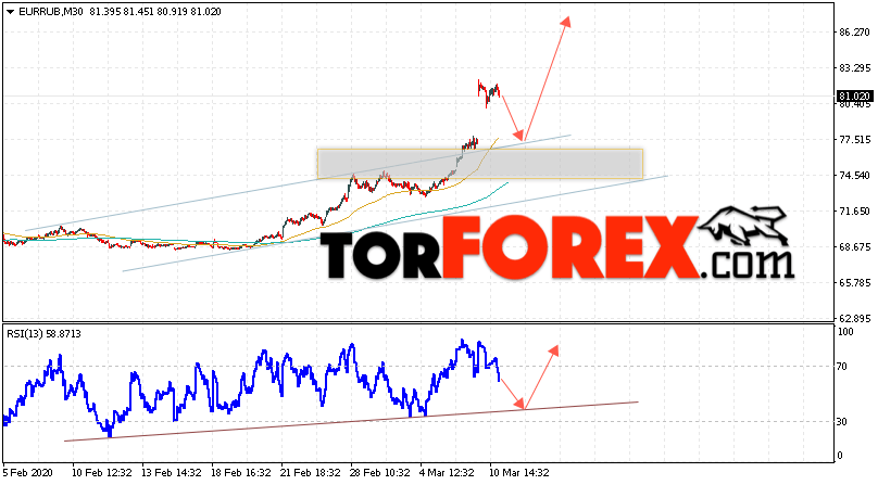 Дополнительным сигнальном в пользу подъёма валютной пары EUR/RUB на Форекс выступит тест восходящей линии тренда на индикаторе относительной силы. Вторым сигналом в пользу роста станет отскок от верхней границы восходящего канала. Отменой варианта роста валютной пары EUR/RUB на Форекс 11 марта 2020 станет падение и пробой уровня 76.05 Евро за Рубль. Это укажет на пробой области поддержки и продолжение падения пары Евро Рубль в область ниже уровня 71.05. Подтверждением роста валютной пары выступит пробой области сопротивления и закрытие котировок инструмента над уровнем 84.05.