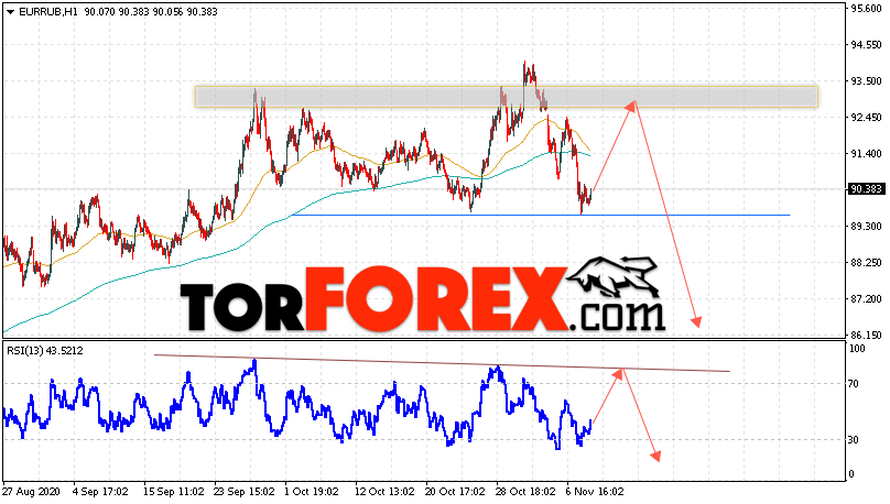 Дополнительным сигнальном в пользу падения валютной пары EUR/RUB на Форекс выступит тест пробитой линии тренда на индикаторе относительной силы. Вторым сигналом станет отскок от уровня формирования правого ”Плеча” модели. Отменой варианта падения валютной пары EUR/RUB на Форекс 11 ноября 2020 станет сильный рост и пробой уровня 94.45 Евро за Рубль. Это укажет на пробой области сопротивления и продолжение роста пары Евро Рубль в область выше уровня 96.15. Подтверждением падения валютной пары выступит пробой области поддержки и закрытие котировок инструмента под уровнем 88.85.