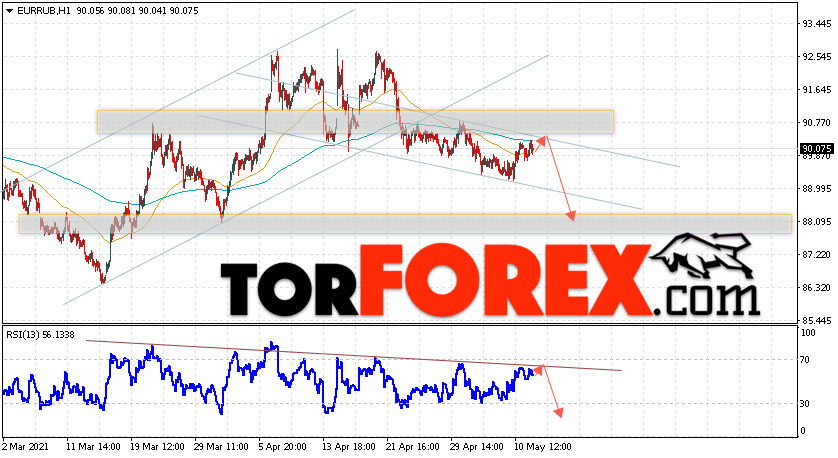Дополнительным сигнальном в пользу снижения валютной пары EUR/RUB на Форекс выступит тест линии тренда на индикаторе относительной силы. Вторым сигналом станет отскок от области сопротивления. Отменой варианта падения валютной пары EUR/RUB на Форекс 12 мая 2021 станет сильный рост и пробой уровня 91.45 Евро за Рубль. Это укажет на пробой области сопротивления и продолжение подъёма пары Евро Рубль в область выше уровня 95.35. Подтверждением падения валютной пары выступит пробой области поддержки и закрытие котировок инструмента под уровнем 88.45.