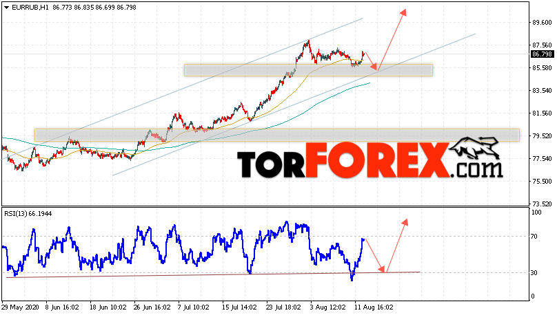 Дополнительным сигнальном в пользу подъёма валютной пары EUR/RUB на Форекс выступит тест линии тренда на индикаторе относительной силы. Вторым сигналом станет отскок от нижней границы восходящего канала. Отменой варианта роста валютной пары EUR/RUB на Форекс 13 августа 2020 станет падение и пробой уровня 83.75 Евро за Рубль. Это укажет на пробой области поддержки и продолжение падения пары Евро Рубль в область ниже уровня 78.45. Подтверждением роста валютной пары выступит пробой области сопротивления и закрытие котировок инструмента над уровнем 88.65.