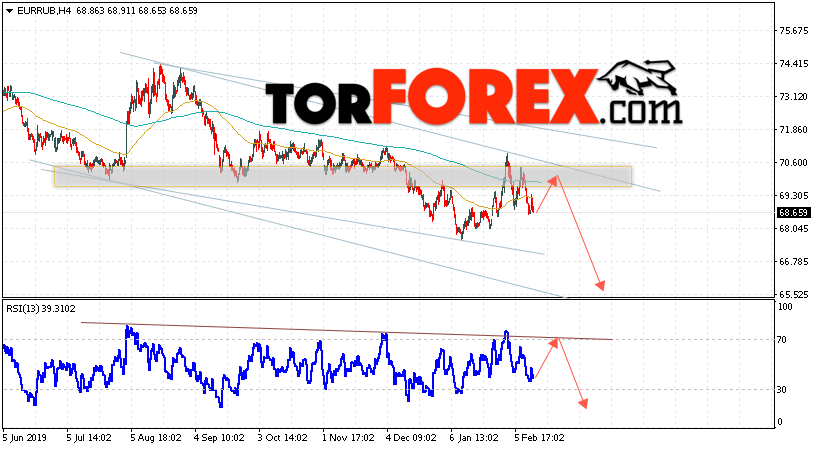 Дополнительным сигнальном в пользу падения валютной пары EUR/RUB на Форекс выступит тест нисходящей линии тренда на индикаторе относительной силы. Вторым сигналом в пользу падения курса европейской валюты станет отскок от верхней границы нисходящего канала. Отменой варианта снижения валютной пары EUR/RUB на Форекс 14 февраля 2020 станет сильный рост и пробой уровня 71.05 Евро за Рубль. Это укажет на пробой области сопротивления и продолжение роста пары Евро Рубль в область выше уровня 73.65. Подтверждением падения валютной пары выступит пробой области поддержки и закрытие котировок инструмента под уровнем 67.65.