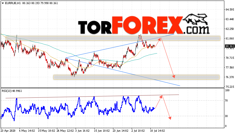 Дополнительным сигнальном в пользу снижения валютной пары EUR/RUB на Форекс выступит тест линии тренда на индикаторе относительной силы. Вторым сигналом станет отскок от верхней границы модели «Волна Вульфа». Отменой варианта падения валютной пары EUR/RUB на Форекс 14 июля 2020 станет сильный рост и пробой уровня 82.45 Евро за Рубль. Это укажет на пробой области сопротивления и продолжение подъёма пары Евро Рубль в область выше уровня 86.45, в этом случае не стоит ожидать отработку разворотной модели. Подтверждением падения валютной пары выступит пробой области поддержки и закрытие котировок инструмента под уровнем 79.05.