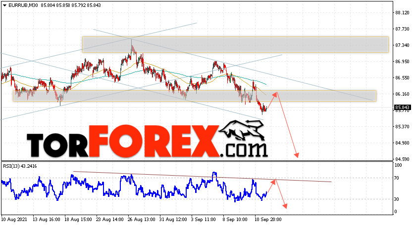 Дополнительным сигнальном в пользу снижения валютной пары EUR/RUB на Форекс выступит тест линии тренда на индикаторе относительной силы. Вторым сигналом станет отскок от верхней границы нисходящего канала. Отменой варианта падения валютной пары EUR/RUB на Форекс 14 сентября 2021 станет сильный рост и пробой уровня 86.85 Евро за Рубль. Это укажет на пробой области сопротивления и продолжение подъёма пары Евро Рубль в область выше уровня 91.45. Подтверждением падения валютной пары выступит пробой области поддержки и закрытие котировок инструмента под уровнем 85.25.