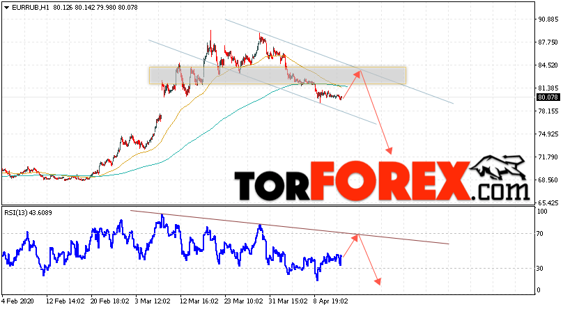 Дополнительным сигнальном в пользу падения валютной пары EUR/RUB на Форекс выступит тест нисходящей линии тренда на индикаторе относительной силы. Вторым сигналом станет отскок от верхней границы нисходящего канала. Отменой варианта падения валютной пары EUR/RUB на Форекс 15 апреля 2020 станет сильный рост и пробой уровня 86.25 Евро за Рубль. Это укажет на пробой области сопротивления и продолжение роста пары Евро Рубль в область выше уровня 90.05. Подтверждением падения валютной пары выступит пробой области поддержки и закрытие котировок инструмента под уровнем 78.05.