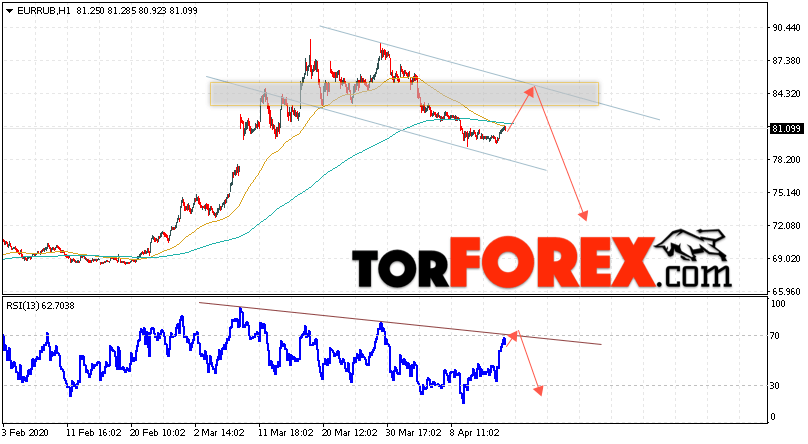 Дополнительным сигнальном в пользу падения валютной пары EUR/RUB на Форекс выступит тест нисходящей линии тренда на индикаторе относительной силы. Вторым сигналом станет отскок от верхней границы нисходящего канала. Отменой варианта падения валютной пары EUR/RUB на Форекс 16 апреля 2020 станет сильный рост и пробой уровня 86.65 Евро за Рубль. Это укажет на пробой области сопротивления и продолжение роста пары Евро Рубль в область выше уровня 90.15. Подтверждением падения валютной пары выступит пробой области поддержки и закрытие котировок инструмента под уровнем 78.05.