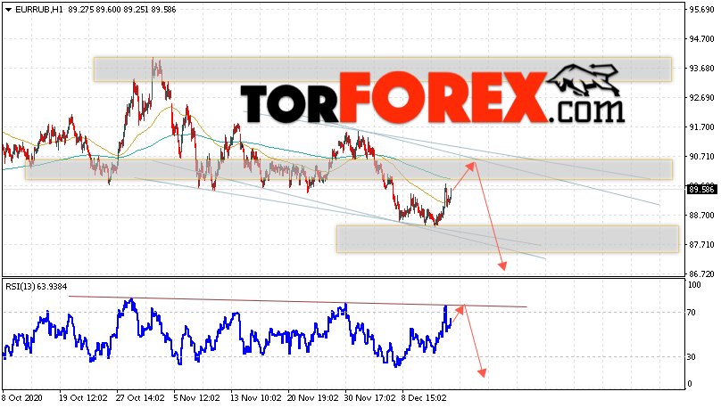 Дополнительным сигнальном в пользу падения валютной пары EUR/RUB на Форекс выступит тест нисходящей линии тренда на индикаторе относительной силы. Вторым сигналом станет отскок от верхней границы нисходящего канала. Отменой варианта падения валютной пары EUR/RUB на Форекс 16 декабря 2020 станет сильный рост и пробой уровня 91.65 Евро за Рубль. Это укажет на пробой области сопротивления и продолжение подъёма пары Евро Рубль в область выше уровня 93.85. Подтверждением падения валютной пары выступит пробой области поддержки и закрытие котировок инструмента под уровнем 87.45.