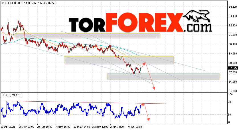 Дополнительным сигнальном в пользу снижения валютной пары EUR/RUB на Форекс выступит тест линии тренда на индикаторе относительной силы. Вторым сигналом станет отскок от верхней границы нисходящего канала. Отменой варианта падения валютной пары EUR/RUB на Форекс 16 июня 2021 станет сильный рост и пробой уровня 89.35 Евро за Рубль. Это укажет на пробой области сопротивления и продолжение подъёма пары Евро Рубль в область выше уровня 92.55. Подтверждением падения валютной пары выступит пробой области поддержки и закрытие котировок инструмента под уровнем 86.05.