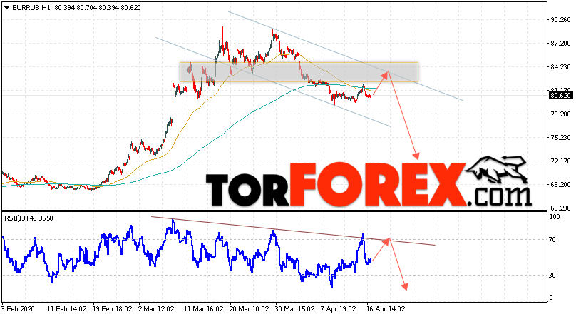 Дополнительным сигнальном в пользу падения валютной пары EUR/RUB на Форекс выступит тест нисходящей линии тренда на индикаторе относительной силы. Вторым сигналом станет отскок от верхней границы нисходящего канала. Отменой варианта падения валютной пары EUR/RUB на Форекс 17 апреля 2020 станет сильный рост и пробой уровня 85.45 Евро за Рубль. Это укажет на пробой области сопротивления и продолжение роста пары Евро Рубль в область выше уровня 90.55. Подтверждением падения валютной пары выступит пробой области поддержки и закрытие котировок инструмента под уровнем 78.05.