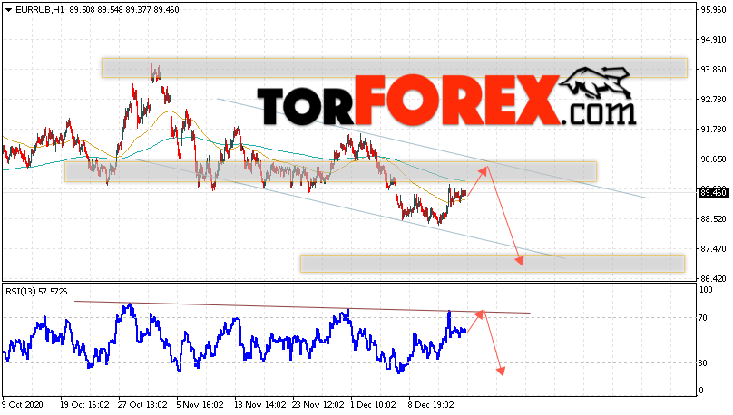 Дополнительным сигнальном в пользу падения валютной пары EUR/RUB на Форекс выступит тест нисходящей линии тренда на индикаторе относительной силы. Вторым сигналом станет отскок от верхней границы нисходящего канала. Отменой варианта падения валютной пары EUR/RUB на Форекс 17 декабря 2020 станет сильный рост и пробой уровня 91.75 Евро за Рубль. Это укажет на пробой области сопротивления и продолжение подъёма пары Евро Рубль в область выше уровня 93.75. Подтверждением падения валютной пары выступит пробой области поддержки и закрытие котировок инструмента под уровнем 87.35.