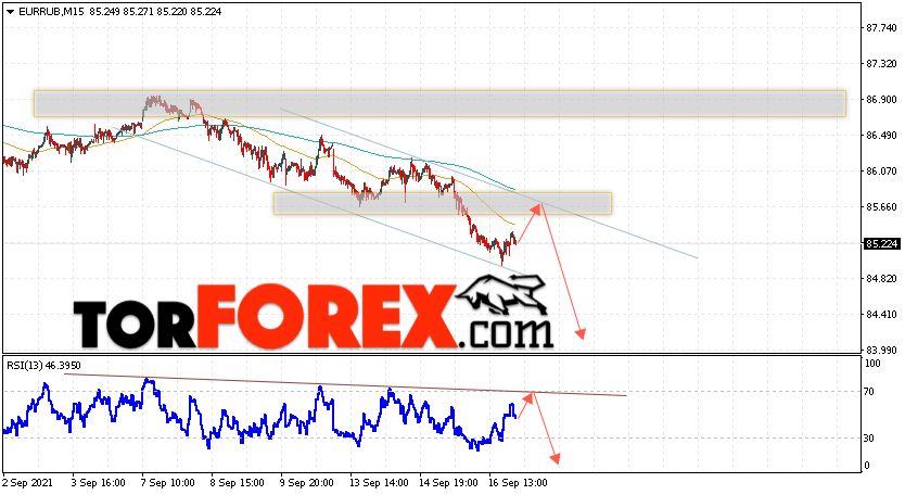 Дополнительным сигнальном в пользу снижения валютной пары EUR/RUB на Форекс выступит тест линии тренда на индикаторе относительной силы. Вторым сигналом станет отскок от верхней границы нисходящего канала. Отменой варианта падения валютной пары EUR/RUB на Форекс 17 сентября 2021 станет сильный рост и пробой уровня 86.35 Евро за Рубль. Это укажет на пробой области сопротивления и продолжение подъёма пары Евро Рубль в область выше уровня 91.55. Подтверждением падения валютной пары выступит пробой области поддержки и закрытие котировок инструмента под уровнем 84.75.